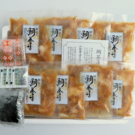 | 商品内容 | 絆屋の鯛茶漬け70g×8食、刻み海苔0.5g・金ごま1g・わさび2.5g×各8袋 |